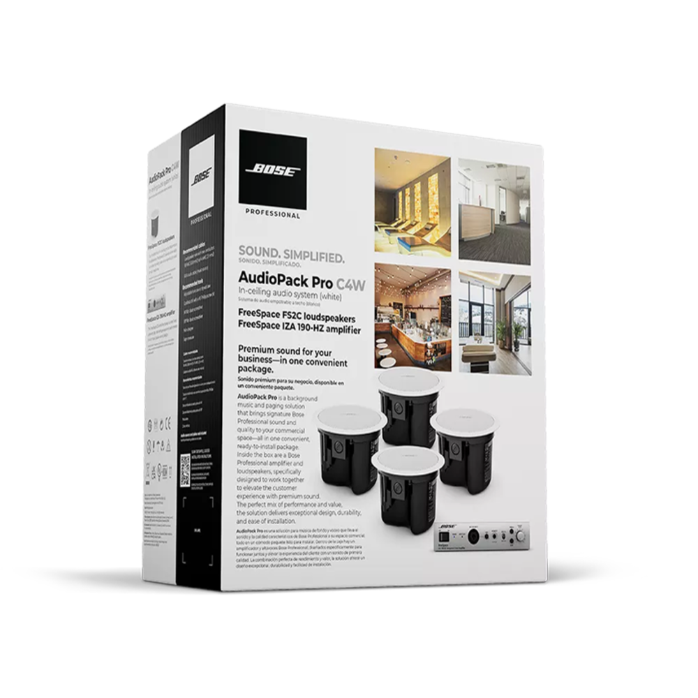 AudioPack Pro es una solución de música de fondo y buscapersonas que lleva el sonido y la calidad característicos de Bose Professional a su negocio, todo en un cómodo paquete listo para instalar. Dentro de la caja hay un amplificador y altavoces Bose Professional , adaptados específicamente para elevar la experiencia del cliente con audio de primera calidad. Esta solución, la combinación ideal de rendimiento y valor, ofrece una durabilidad excepcional, un diseño limpio y una instalación sencilla. El sistema incluye FreeSpace FS, nuestra fiable línea de altavoces empotrables en techo y de montaje en superficie. La mezcla perfecta de rendimiento y valor, combinan durabilidad, diseño limpio y facilidad de instalación. FreeSpace FS ofrecen una tonalidad extraordinariamente uniforme, una reproducción clara de la voz y una respuesta suave. Además, su agradable estética se integra en cualquier entorno.
