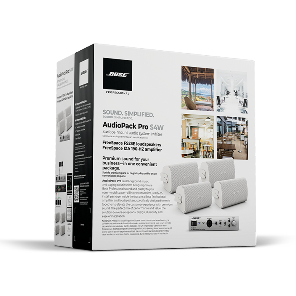 AudioPack Pro es una solución de música de fondo y buscapersonas que lleva el sonido y la calidad característicos de Bose Professional a su negocio, todo en un cómodo paquete listo para instalar. Dentro de la caja hay un amplificador y altavoces Bose Professional , adaptados específicamente para elevar la experiencia del cliente con audio de primera calidad. Esta solución, la combinación ideal de rendimiento y valor, ofrece una durabilidad excepcional, un diseño limpio y una instalación sencilla. El sistema incluye FreeSpace FS, nuestra fiable línea de altavoces empotrables en techo y de montaje en superficie. La mezcla perfecta de rendimiento y valor, combinan durabilidad, diseño limpio y facilidad de instalación. FreeSpace FS ofrecen una tonalidad extraordinariamente uniforme, una reproducción clara de la voz y una respuesta suave. Además, su agradable estética se integra en cualquier entorno.